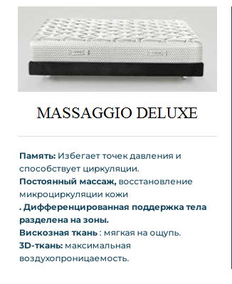 Беспружинный матрас Massaggio Deluxe из коллекции Massaggio. Матрас высотой 25 см, со средним уровнем поддержки спины и средним по жесткости уровнем комфорта. Разработанная фабрикой Magniflex пена Magnifoam Memoform с эффектом памяти размещена в подкладке чехла и осуществляет легкий массажное воздействие за счет своей специальной формы. Также в матрасе, в отличие от модели Massaggio Light, присутствует дополнительный слой под чехлом в виде 2 см материала Memoform, что в свою очередь увеличивает комфортность матраса. Magniflex Memoform имеет высокие анатомические свойства, реагирует не на тепло, а именно на вес. Таким образом, в отличие от обычной пены с эффектом памяти, Вы спите на матрасе, а не в матрасе.